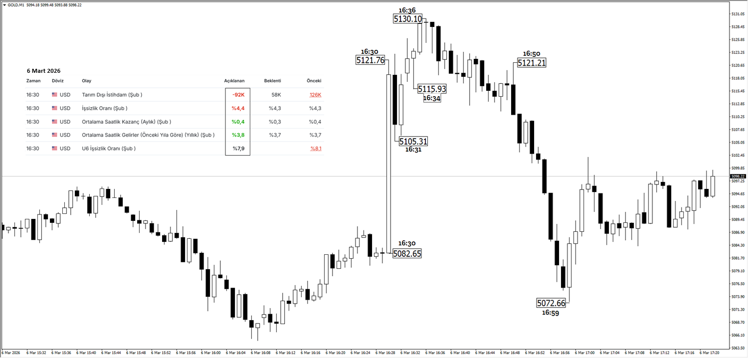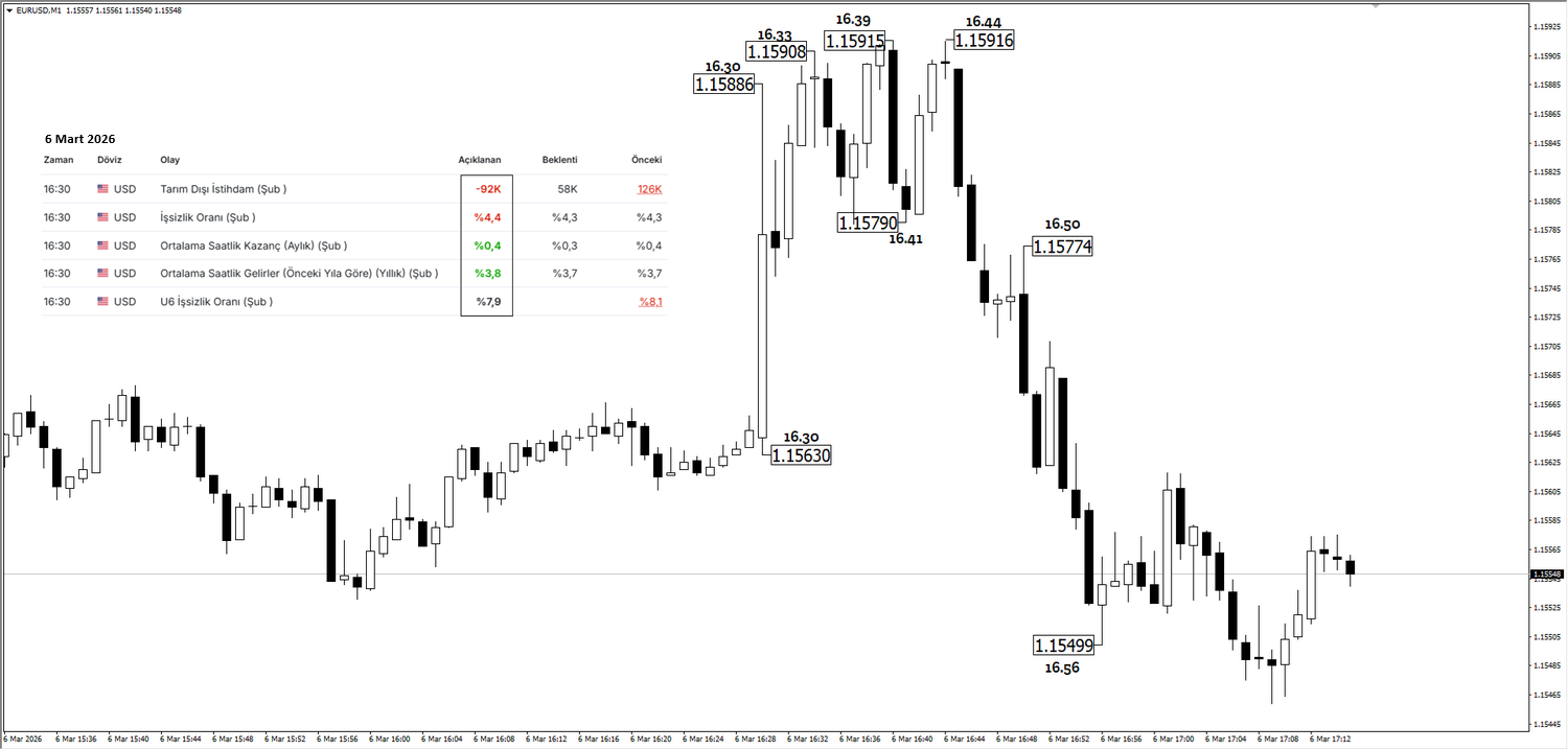 6 Mart 2026 tarihinde yani bir önceki ay açıklanan ABD verileri ile birlikte EURUSD ve Ons Altın, fiyatı olumsuz gelen verilerin etkisiyle ilk dakikada önemli bir pozitif performans sergilemiştir. Ancak ilk dakikada oluşan bu fiyatlama davranışı takip eden dakikalarda hem işlem hacmi hem de piyasa algısı açısından farklı bir seyir izlemeye başlamıştır.
