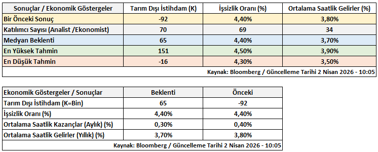 Tarım Dışı İstihdam, İşsizlik Oranı ve Ortalama Saatlik Kazançlar verileri; savaşın ekonomik etkilerinin işgücü piyasasına ilk yansımalarını görebileceğimiz önemli bir set olacak.