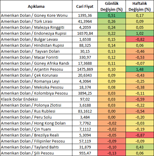 23 gelişen ülke para biriminin yer aldığı EMEA sepetinde ABD Doları karşısındaki günlük performanslara bakıldığında; en güçlü para birimi Tayland Bahtı, en zayıf para birimi ise Şili Pesosu olmuştur. Türk Lirası bu listenin zayıf bölgesinde seyrini sürdürürken USDTRY analizin hazırlandığı şu sıralar 41,38 seviyesine yakın seyrini sürdürmektedir.