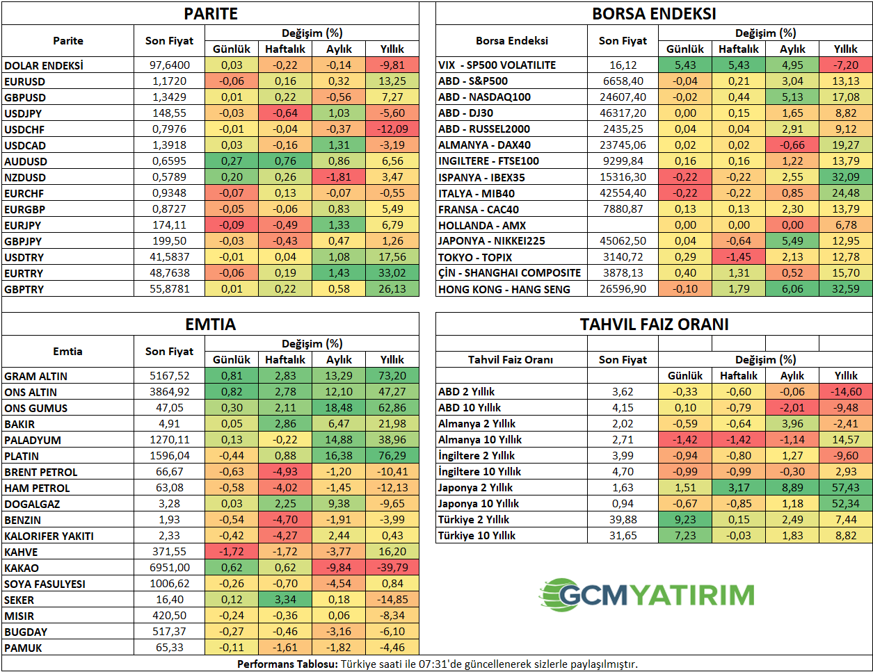Ons altın rekor üzerine rekor kırarken, petrol tarafında satışların ağırlık kazandığını izledik. Arz riskleri azalırken, OPEC+’nın Pazar günü gerçekleştireceği toplantıda, Ekim ayında olduğu gibi Kasım ayı için de üretimi günlük 137 bin varil artıracağı öngörülüyor. Kuzey Irak’tan petrol akışının tekrar başlaması ve Trump ile Netanyahu’nun Gazze’de ateşkes konusunda geçici bir anlaşma sağladığının açıklanması bu tabloda etkili oldu.