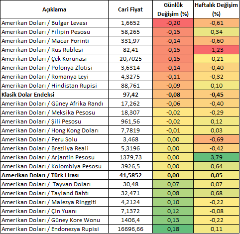 Klasik Dolar Endeksi haftanın ilk iki işlem gününde negatif bir performans sergiledi. Bugün de başa baş bölgesine yakın olmakla birlikte negatif görünümünü sürdürmektedir. 23 gelişen ülke para biriminin yer aldığı EMEA sepetinde ise ABD Doları karşısındaki ayrışma devam ediyor. Bugüne odaklandığımızda günlük performanslar içerisinde ABD Doları karşısındaki en güçlü para birimi Bulgar Levası iken, en zayıf para birimi ise Endonezya Rupisi olmuştur. Türk Lirası bu listenin nötr bölgesinde seyrini sürdürürken USDTRY analizin hazırlandığı şu sıralar 41,58 seviyesine yakın seyrini sürdürmektedir.