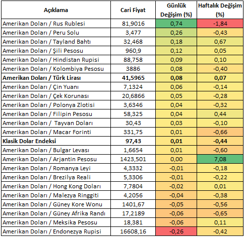 Klasik Dolar Endeksi haftanın ilk üç işlem gününü tamamladığında negatif bir performans ile sürecine devam etmektedir. Bugün ise başa baş bölgesinin çok az üzerinde kayıplarını telafi etmeye çabalıyor. 23 gelişen ülke para biriminin yer aldığı EMEA sepetinde ise ABD Doları karşısındaki ayrışma devam ediyor. Bugüne odaklandığımızda günlük performanslar içerisinde ABD Doları karşısındaki en güçlü para birimi Endonezya Rupisi iken, en zayıf para birimi ise Rus Rublesi olmuştur. Türk Lirası bu listenin zayıf bölgesinde seyrini sürdürürken USDTRY analizin hazırlandığı şu sıralar 41,59 seviyesine yakın seyrini sürdürmektedir.