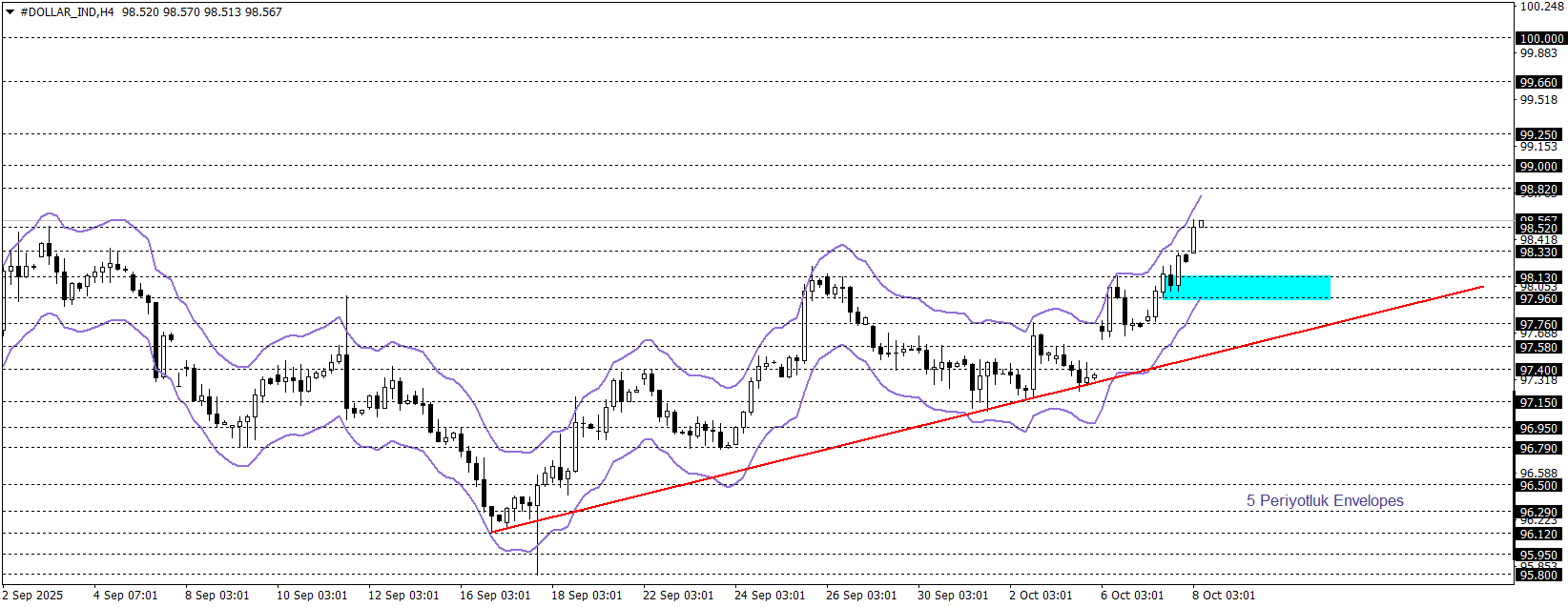 Klasik Dolar Endeksi güncel tabloda %0,30’u aşan hamleleri ile yükselen trend üzerinde 98,50 seviyelerinde seyrederek pozitif görünümünü sürdürüyor. Endeks, Envelopes göstergesinin alt sınırının da işaret ettiği 97,96 – 98,13 bölgesi üstünde fiyatlandığı sürece 100 önemli psikolojik seviyesine doğru hareket potansiyelini sürdürebilir. Buna karşın, takip edilen bölgenin altında kalıcılık sağlanması durumunda trend çizgisine yönelik geri çekilme hareketi gündeme gelebilir.