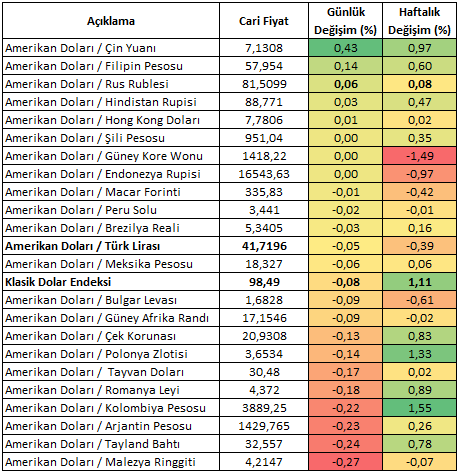 Klasik Dolar Endeksinin pozitif fiyatlama davranışı ile baskı kurmaya çalıştığı bir haftanın dördüncü işlem günündeyiz. An itibariyle kısmi bir baskı izlesek de genel iyimserlik devam ediyor. 23 gelişen ülke para biriminin yer aldığı EMEA sepetinde ise ABD Doları karşısındaki ayrışma devam ediyor ve bu ayrışma içerisinde güçlü görünen sayısı daha fazla. Günlük performanslar içerisinde ABD Doları karşısındaki en güçlü para birimi Malezya Ringgiti iken, en zayıf para birimi ise Çin Yuanı olmuştur. Türk Lirası bu listenin zayıf bölgesinde seyrini sürdürürken USDTRY analizin hazırlandığı şu sıralar 41,71 seviyesine yakın seyrini sürdürmektedir.