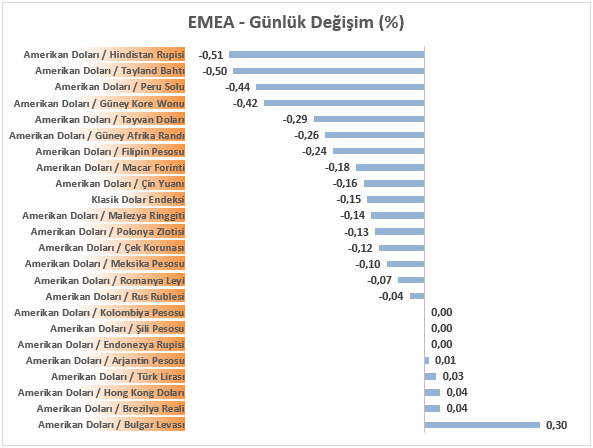 Dolar Endeksinin hafta ortasına geldiğimiz bu süreçte performans olarak sınırlı hareketler kaydettiğini ve an itibariyle de başa baş seviyesinin hafif üzerinde pozitif bölgede kaldığını görmekteyiz. 23 gelişen ülke para biriminin yer aldığı EMEA sepetinde ise ABD Doları karşısındaki ayrışma devam ediyor. Günlük performanslar içerisinde ABD Doları karşısındaki en güçlü para birimi Hindistan Rupisi iken, en zayıf para birimi ise Bulgar Levası olmuştur. Türk Lirası mevcut listenin zayıf bölgesinde hareket etmekle birlikte USDTRY kuru analizin hazırlandığı şu sıralar 41,82 seviyesine yakın seyrini sürdürmektedir.