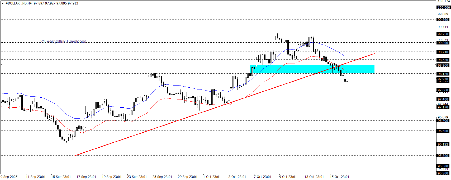 Klasik Dolar Endeksi güncel tabloda dünden bugün %0,40’u aşan düşüşle 97,90 seviyelerinde seyrederek Eylül ortasından beri sürdürdüğü yükseliş trendinin altına geçerek negatif görünüm sunuyor. Endeks, Envelopes göstergesinin alt sınırının da işaret ettiği 98,36 – 98,12 bölgesi altında fiyatlandığı sürece 97,14 önemli seviyesine doğru hareket potansiyelini sürdürebilir. Buna karşın, takip edilen bölgenin üstündeki kalıcılık 100 psikolojik seviyesini gündeme getirebilir.