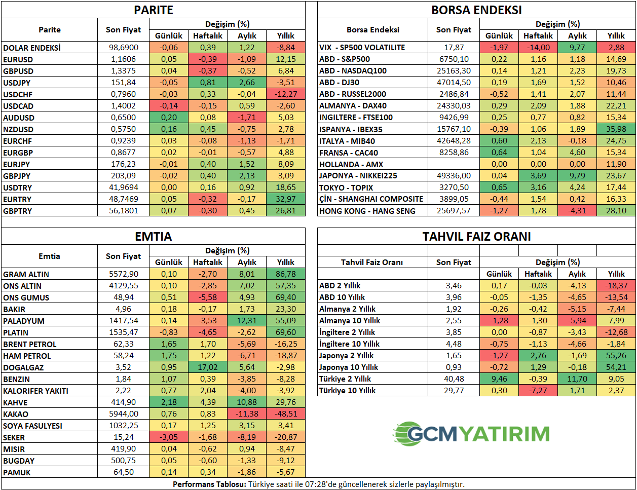 İlgili sayfada yer alan ekonomik takvim içeriği, güvenilir yurt dışı haber ve veri sağlayıcılardan temin edilmektedir. Ekonomik takvim içeriğinde yer alan haberler, haberlerin açıklanma tarihi ve zamanı, önceki, beklenti ve açıklanan rakamlarda gerçekleştirilecek olası değişiklikler, veri sağlayıcı kurumlar tarafından yapılmaktadır. Benzeri durumlardan kaynaklanacak olası değişimlerden GCM Yatırım Menkul Değerler A.Ş. sorumlu tutulamaz.