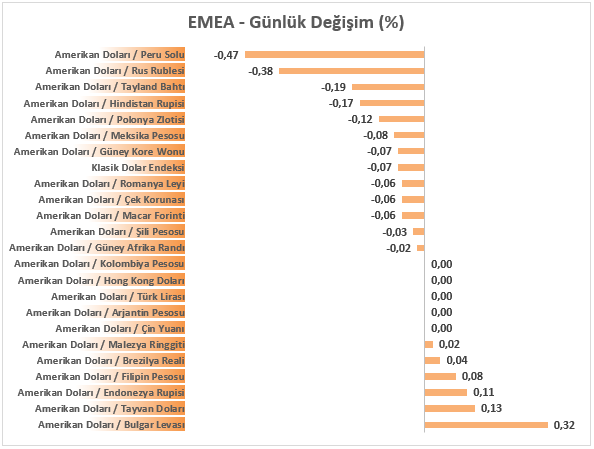 Hafta ortasındayız ve Dolar Endeksi her ne kadar anlık olarak kısmi negatif bir performans sunsa da genel reaksiyon açısından pozitif bölgede kalmaya devam ediyor. 23 gelişen ülke para biriminin yer aldığı EMEA sepetinde ise ABD Doları karşısındaki ayrışma sürüyor. Günlük performanslar içerisinde ABD Doları karşısındaki en güçlü para birimi Peru Solu iken, en zayıf para birimi ise Bulgar Levası olmuştur. Türk Lirası listenin nötr bölgesinde seyrini sürdürürken USDTRY kuru analizin hazırlandığı şu sıralar 41,96 seviyesine yakın seyrini sürdürmektedir.