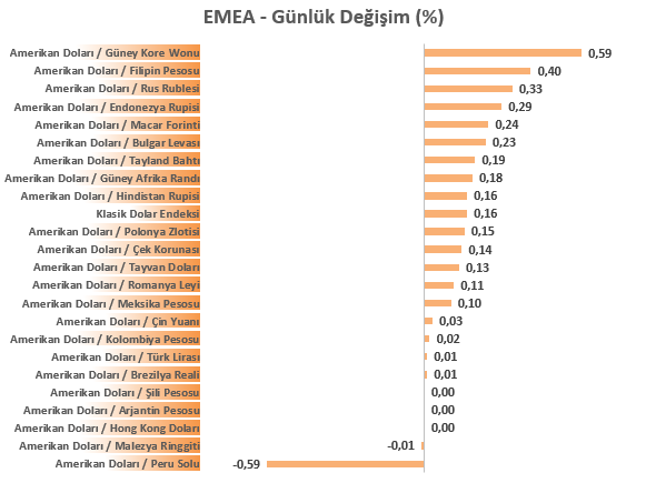 Dolar Endeksi haftanın geneli itibariyle pozitif bir seyir izlemekle birlikte anlık olarak da bu tutumunu sürdürmektedir. 23 gelişen ülke para biriminin yer aldığı EMEA sepetinde ise ABD Doları karşısındaki ayrışma devam ediyor ancak çoğunluk baskı görmektedir. Günlük performanslar içerisinde ABD Doları karşısındaki en zayıf para birimi Güney Kore Wonu iken, en güçlü para birimi ise Peru Solu olmuştur. Türk Lirası listenin zayıf bölgesinde seyrini sürdürürken USDTRY kuru analizin hazırlandığı şu sıralar 41,97 seviyesine yakın seyrini sürdürmektedir.