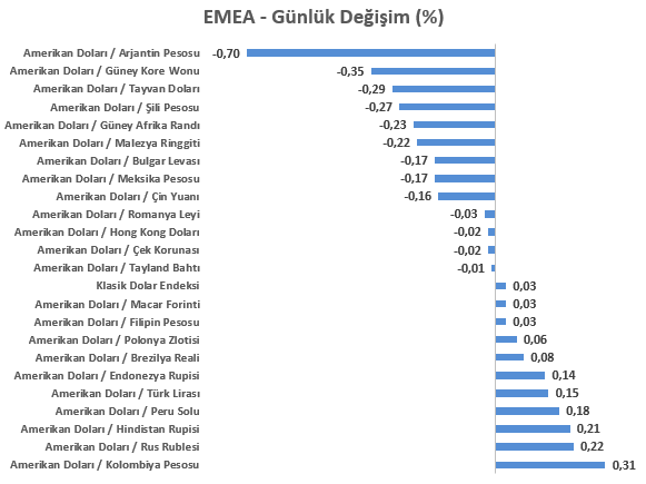 Hem ABD Dolarının hem de gelişen ülke para birimlerinin etkili bir performans sergileyeceği bir haftada ekim ayını tamamlayacağız. Dolar Endeksi iyimser bir performans ile haftaya başladı. 23 gelişen ülke para biriminin yer aldığı EMEA sepetinde ise ABD Doları karşısındaki ayrışma devam ediyor. Günlük performanslar içerisinde ABD Doları karşısındaki en zayıf para birimi Kolombiya Pesosu iken, en güçlü para birimi ise Arjantin Pesosu olmuştur. Türk Lirası listenin zayıf bölgesinde seyrini sürdürürken USDTRY kuru analizin hazırlandığı şu sıralar 42,00 seviyesine yakın seyrini sürdürmektedir.