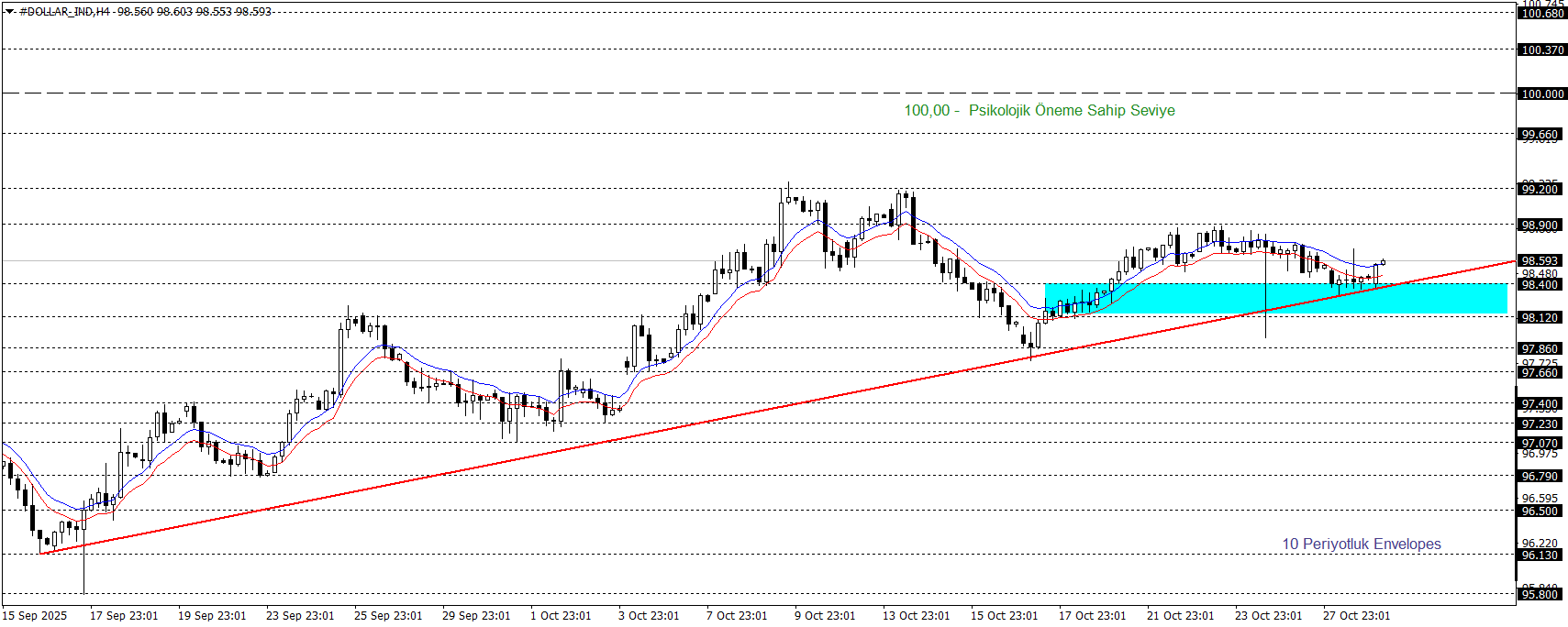 Klasik Dolar Endeksi, Eylül ortasından bu yana sürdürdüğü yükseliş trendini koruyarak pozitif bir görünüm sergiliyor. Endeks, 98,50 – 98,65 bölgesinin üzerinde kaldığı sürece 100 seviyesine doğru yükseliş potansiyelini sürdürebilir. Buna karşılık, söz konusu bölgenin altına sarkması durumunda 97,66 seviyesi yeniden gündeme gelebilir.