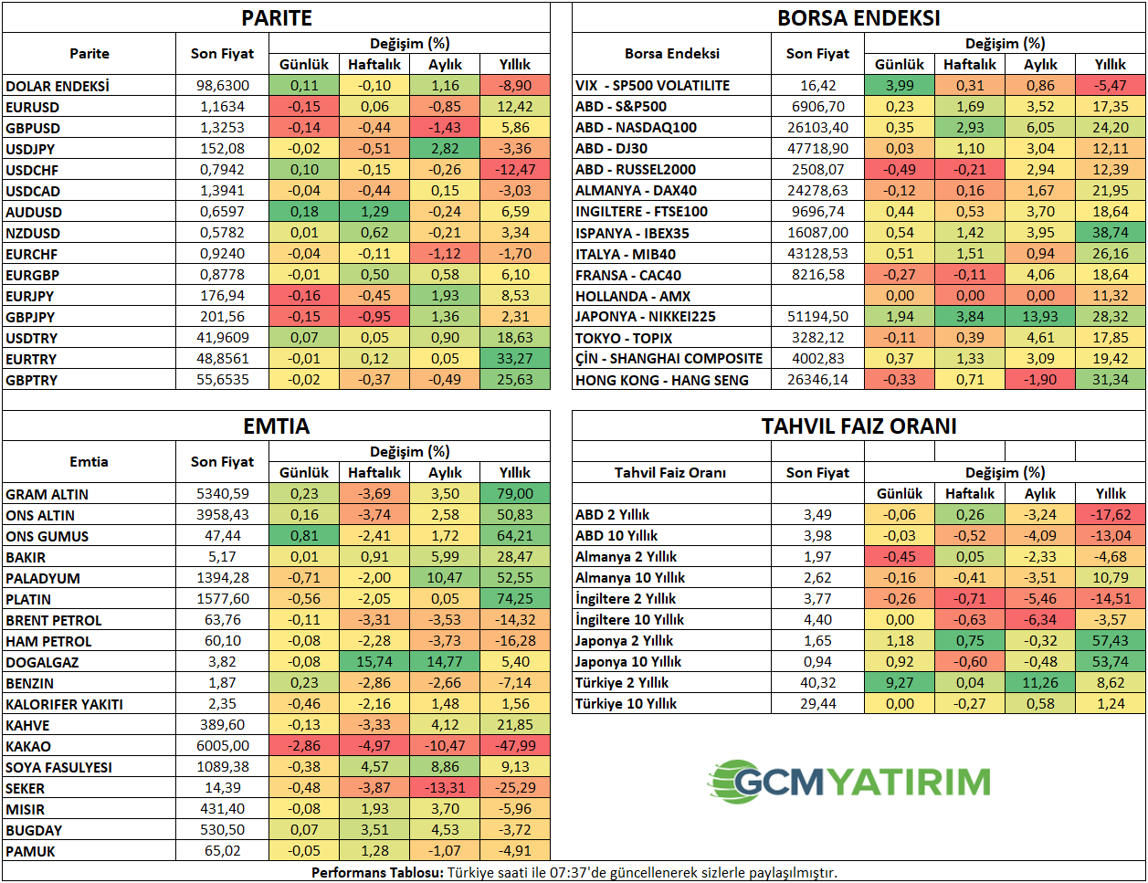 Asya endeksleri ve özellikle de Japon Nikkei endeksi, yapay zeka sektörüne ilişkin bilanço iyimserliği ve Fed’in neredeyse kesin gözüyle bakılan faiz indirimi kararının beklendiği toplantı öncesinde yükseliş eğilimi gösterdi. Japon Nikkei endeksi yükselişlere 2%’ye yaklaşan kazanımla liderlik etti. ABD endeks vadelileri ise bu süreçte daha karışık bir seyir izledi. Nasdaq endeks vadelileri 0,2% civarında pozitif eğilimi gösterdi. ABD 10 yıllık tahvil faizi 3,98% bölgesinde seyrediyor. Dolar endeksi ise dünkü sınırlı düşüş sonrası toparlanma eğilimi gösterdi.