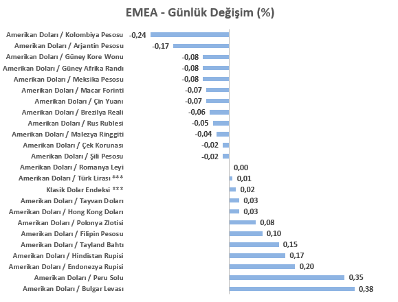 Yeni bir aya pozitif bir reaksiyon ile başlayan Dolar endeksi için hafta içerisindeki gelişmeler özellikle psikolojik 100 bölgesini aşabilecek mi yoksa 95 – 100 bandına devam mı edecek sorusunun cevabı için önemli olacaktır. 23 gelişen ülke para biriminin yer aldığı EMEA sepetinde ise ABD Doları karşısındaki ayrışma devam ediyor. Günlük performanslar içerisinde en güçlü para birimi Kolombiya Pesosu iken, en zayıf para birimi ise Bulgar Levası olmuştur. Türk Lirası listenin zayıf bölgesinde seyrini sürdürürken USDTRY kuru analizin hazırlandığı şu sıralar 42,05 seviyesine yakın seyrini sürdürmektedir.