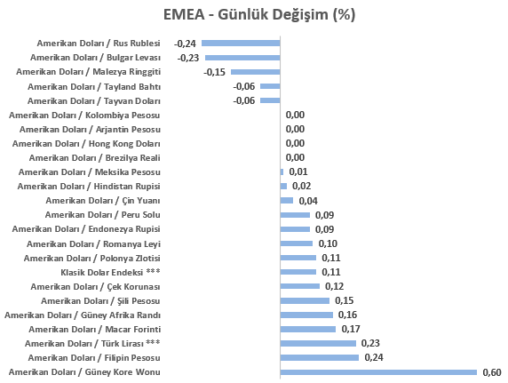 Dolar Endeksinin haftalık bazda iyimserliğini korumasına karşın kritik eşik bölge 100 seviyesi üzerinde kalıcılaşamadığını görebilmekteyiz. 95 – 100 bandı devam edip etmeyeceği hususunda bugünkü haftalık kapanışı takip etmekle birlikte an itibariyle sınırlı pozitif bir performans sergilemektedir. 23 gelişen ülke para biriminin yer aldığı EMEA sepetinde ise ABD Doları karşısındaki ayrışma devam etmekle birlikte çoğunluk baskı görmektedir. Günlük performanslar içerisinde en zayıf para birimi Güney Kore Wonu iken, en güçlü para birimi ise Rus Rublesi olmuştur. Türk Lirası listenin zayıf bölgesinde seyrini sürdürürken USDTRY kuru analizin hazırlandığı şu sıralar 42,18 seviyesine yakın seyrini sürdürmektedir.