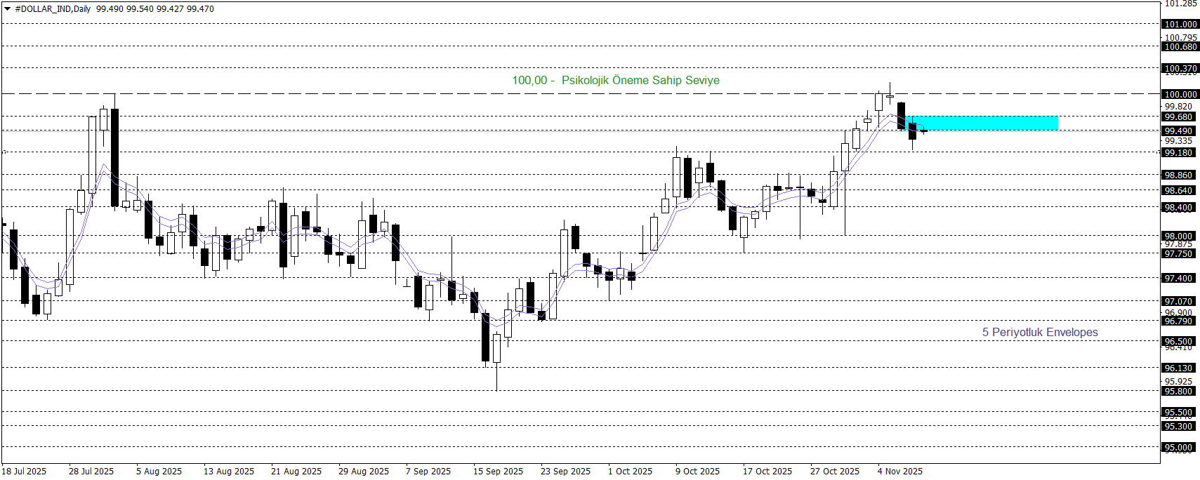 Klasik Dolar Endeksi, kısa vadede 99,49 – 99,68 aralığının altında seyretmeye devam ederken, bu durum yukarı yönlü momentumu zayıflatıyor ve 98,00 seviyesinin yeniden test edilme riskini artırıyor. Söz konusu bölgenin altında kalındığı sürece, endeksin 100 seviyesine doğru toparlanma olasılığı sınırlı kalabilir ve geri çekilme eğilimi ön planda olabilir. Ancak 99,49 – 99,68 bandının üzerinde kalıcılık sağlanması halinde, 100 seviyesine doğru bir hareket yeniden gündeme gelebilir.