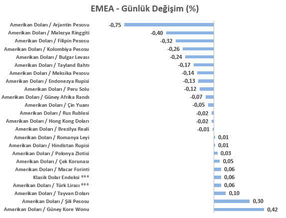Dolar Endeksinin kritik eşik bölge 100 seviyesine ulaştığı ancak üzerinde kalıcılaşamadığı bir süreçte yeni bir haftaya başlıyoruz. An itibariyle iyimser bir reaksiyon veren endeksin bu haftaki tutumu 95 – 100 bandı devam edip etmemesi adına önemlidir. 23 gelişen ülke para biriminin yer aldığı EMEA sepetinde ise ABD Doları karşısındaki ayrışma devam etmektedir. Günlük performanslar içerisinde en zayıf para birimi Güney Kore Wonu iken, en güçlü para birimi ise Arjantin Pesosu olmuştur. Türk Lirası listenin zayıf bölgesinde seyrini sürdürürken USDTRY kuru analizin hazırlandığı şu sıralar 42,23 seviyesine yakın seyrini sürdürmektedir.
