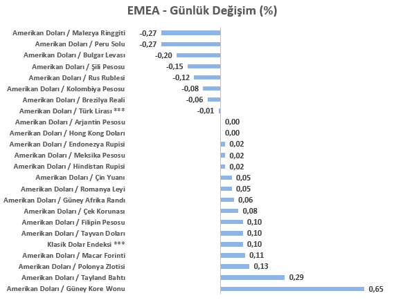 Dolar Endeksinin 100 seviyesi altındaki seyirle 95 – 100 bandı içerisindeki seyrini devam ettirebilme beklentisi gündemi meşgul ederken ABD’de hükümetin açılacak olmasıyla birlikte gözler açıklanmayan ABD verilerinin sonuçlarında dolayısıyla da ABD Dolarının bu veriler karşısında vereceği reaksiyonda olacaktır. An itibariyle sınırlı bir pozitif fiyatlama davranışında yer alan endeks kritik eşik 100 seviyesi altında işlem görmektedir. 23 gelişen ülke para biriminin yer aldığı EMEA sepetinde ise ABD Doları karşısındaki ayrışma devam etmektedir. Günlük performanslar içerisinde en zayıf para birimi Güney Kore Wonu iken, en güçlü para birimi ise Malezya Ringgiti olmuştur. Türk Lirası listenin güçlü bölgesinde seyrini sürdürürken USDTRY kuru analizin hazırlandığı şu sıralar 42,23 seviyesine yakın seyrini sürdürmektedir.