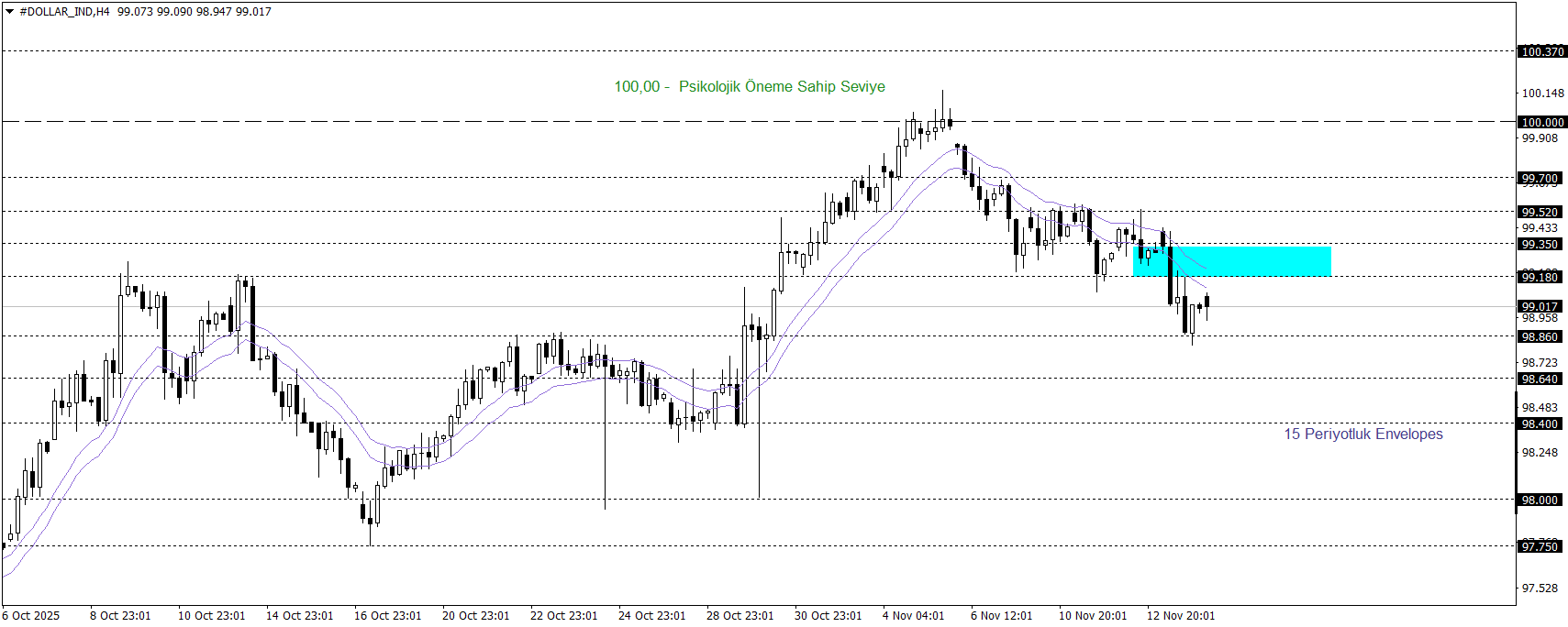 Klasik Dolar Endeksi güncel dönemde 99,00 seviyelerinde negatif tabloyu sürdürüyor. Endeks, Envelopes göstergesinin üst sınırının da işaret ettiği 99,35 – 99,18 bölgesi altında kaldığı sürece 98,00 seviyesine kadar geri çekilme potansiyelini sürdürebilir. Ancak söz konusu bölgenin üzerinde kalıcılık sağlanması halinde, 100,00 seviyesine doğru yukarı yönlü hareket alanı gündeme gelebilir.