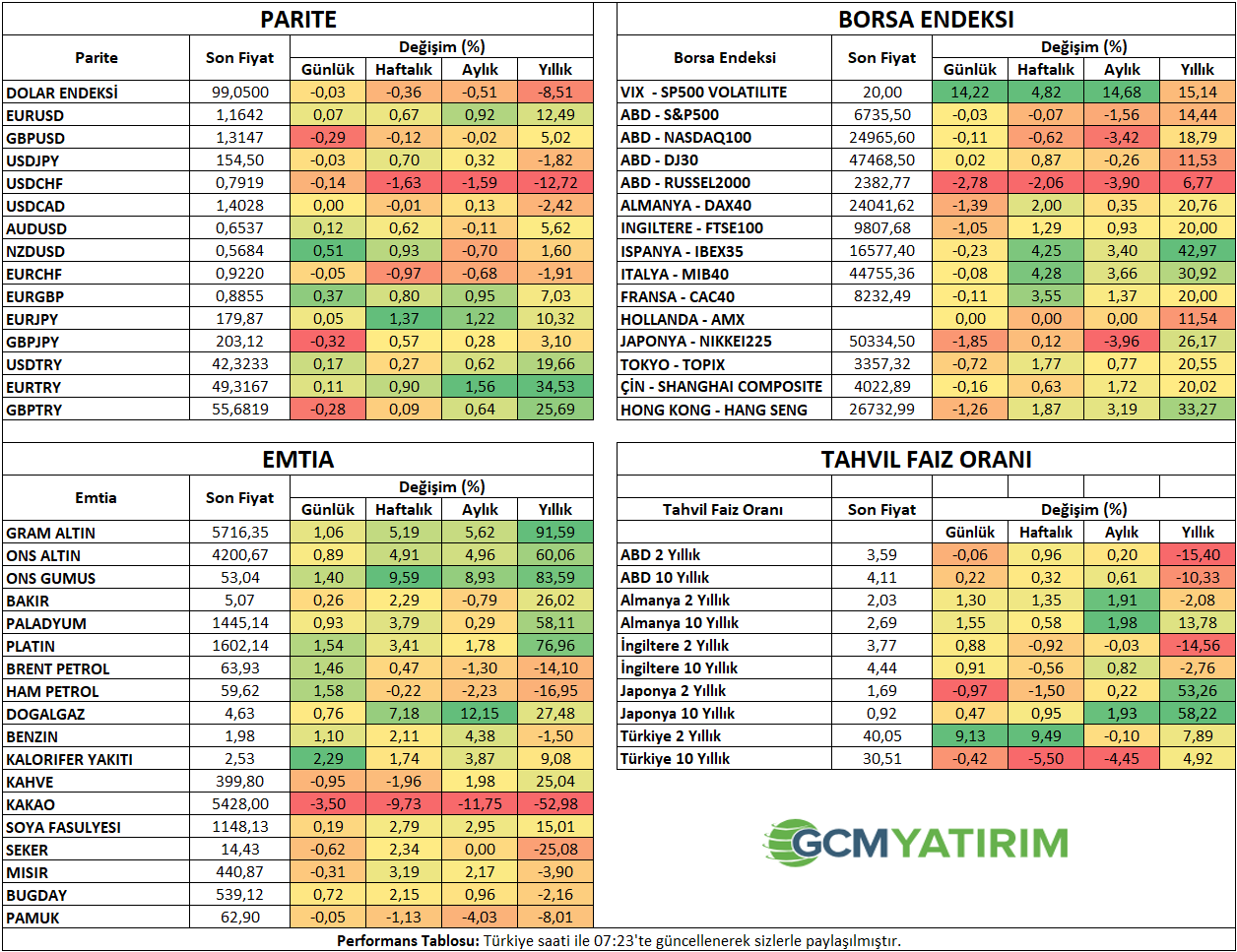 İlgili sayfada yer alan ekonomik takvim içeriği, güvenilir yurt dışı haber ve veri sağlayıcılardan temin edilmektedir. Ekonomik takvim içeriğinde yer alan haberler, haberlerin açıklanma tarihi ve zamanı, önceki, beklenti ve açıklanan rakamlarda gerçekleştirilecek olası değişiklikler, veri sağlayıcı kurumlar tarafından yapılmaktadır. Benzeri durumlardan kaynaklanacak olası değişimlerden GCM Yatırım Menkul Değerler A.Ş. sorumlu tutulamaz.