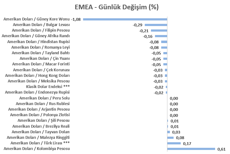 Dolar Endeksinin kritik eşik bölge 100 seviyesi altında kalmaya devam ettiği ve 95 – 100 bandının gündemimizi meşgul ettiği bir süreçte haftayı kapatırken anlık performansta da sınırlı bir negatif fiyatlama davranışı kaydettiğini izlemekteyiz. 23 gelişen ülke para biriminin yer aldığı EMEA sepetinde ise ABD Doları karşısındaki ayrışma devam ediyor. Günlük performanslar içerisinde en zayıf para birimi Kolombiya Pesosu iken, en güçlü para birimi ise Güney Kore Wonu olmuştur. Türk Lirası listenin zayıf bölgesinde seyrini sürdürürken USDTRY kuru analizin hazırlandığı şu sıralar 42,32 seviyesine yakın seyrini sürdürmektedir.