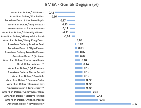 ABD’de hükümet açılması ardından gözler açıklanmayan istihdam verilerine çevrilirken Dolar Endeksinin psikolojik 100 seviyesi altında kalmaya devam ettiğini görmekteyiz. Haftanın geneli itibariyle 100 seviyesindeki tutumu 95 – 100 bandı tamam mı devam mı sorgulaması yapmamızı sağlayabilir. 23 gelişen ülke para biriminin yer aldığı EMEA sepetinde ise ABD Doları karşısındaki ayrışma devam ediyor. Günlük performanslar içerisinde en zayıf para birimi Tayvan Doları iken, en güçlü para birimi ise Şili Pesosu olmuştur. Türk Lirası listenin zayıf bölgesinde seyrini sürdürürken USDTRY kuru analizin hazırlandığı şu sıralar 42,33 seviyesine yakın seyrini sürdürmektedir.
