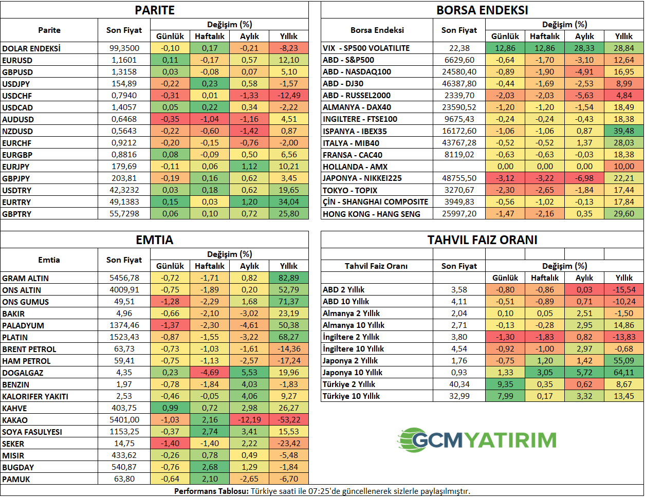 ABD endeks vadelileri ise dün spot işlemlerde yaklaşık 1%’lik kayıplar sonrası düşüşün devam edebileceğini gösterdi. Nasdaq vadeli işlemleri yaklaşık 0,6% geriledi. ABD 10 yıllık tahvil faizi 4,11% bölgesinde seyrediyor. Dolar endeksi dünkü yükseliş sonrası sakin seyretti.