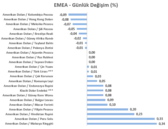 Klasik Dolar endeksi dün sergilediği iyimser fiyatlama reaksiyonu ile psikolojik 100 seviyesi üzerine çıktı ve an itibariyle de bu seviye üzerinde seyrini sürdürmektedir. Haftayı bu bölge üzerinde kapatmayı başarabilecek mi hususu, gelişmekte olan ülke para birimleri performansını değerlendirebilmek adına önemlidir. 23 gelişen ülke para biriminin yer aldığı EMEA sepetinde ise ABD Doları karşısındaki ayrışma devam ediyor. Günlük performanslar içerisinde en zayıf para birimi Malezya Ringgiti iken, en güçlü para birimi ise Kolombiya Pesosu olmuştur. Türk Lirası listenin zayıf bölgesinde seyrini sürdürürken USDTRY kuru analizin hazırlandığı şu sıralar 42,35 seviyesine yakın seyrini sürdürmektedir.