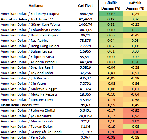 Hafta ortasındayız. Şükran Günü sebebiyle küresel piyasalarda haftanın kalan 2 gününde daha sakin bir fiyatlama görülebilme ihtimaline karşın bugün hareket marjı biraz daha etkili olabilme ihtimali göz ardı edilmemelidir. Klasik Dolar endeksi teorik 100,35 / psikolojik 100 seviyesi altında baskı görmekte ve an itibariyle de sınırlı bir negatif fiyatlama gerçekleştirmektedir. 23 gelişen ülke para biriminin yer aldığı EMEA sepetinde ise ABD Doları karşısındaki ayrışma devam ediyor. Günlük performanslar içerisinde en zayıf para birimi Endonezya Rupisi iken, en güçlü para birimi ise Peru Solu olmuştur. Türk Lirası listenin zayıf bölgesinde seyrini sürdürürken USDTRY kuru analizin hazırlandığı şu sıralar 42,45 seviyesine yakın seyrini sürdürmektedir.