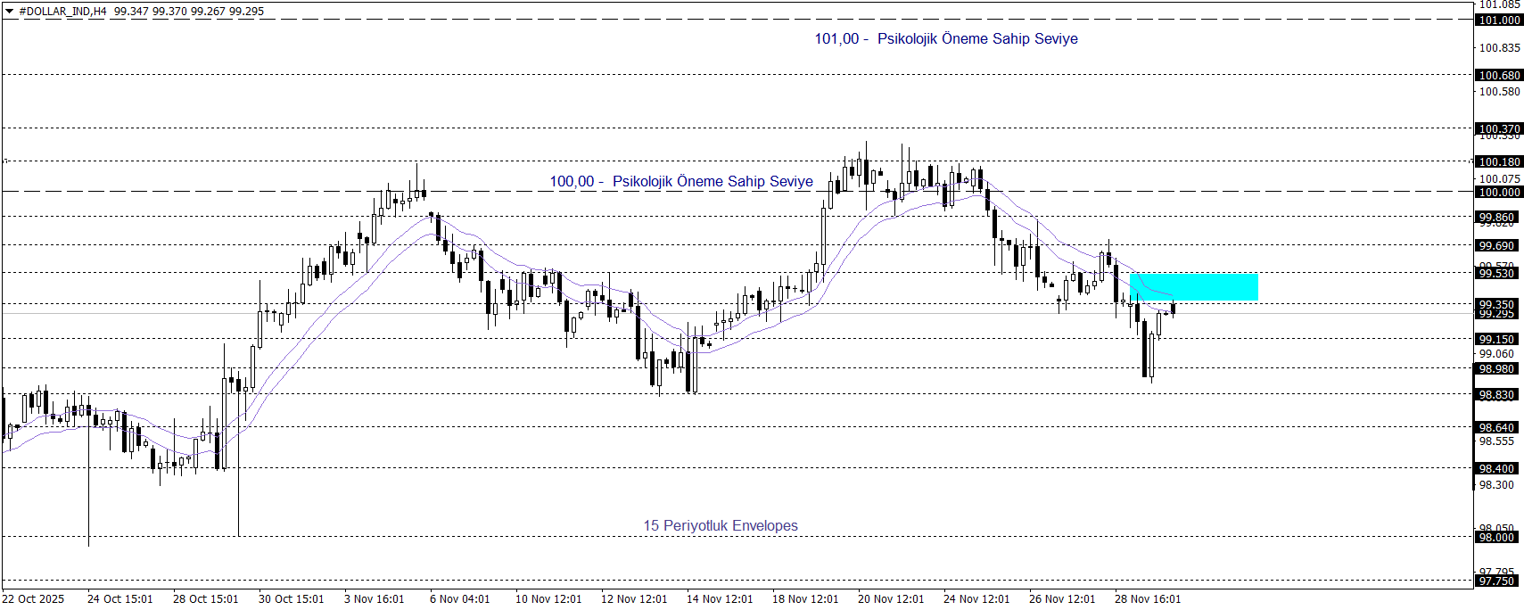 Klasik Dolar Endeksi güncel dönemde 99,28 seviyelerinde kısa vadede negatif tablo ortaya koyuyor. Endeks, Envelopes göstergesinin üst sınırının da işaret ettiği 99,35 – 99,53 bölgesi altında kaldığı sürece 98,00 seviyesine kadar geri çekilme potansiyelini sürdürebilir. Ancak söz konusu bölgenin üzerinde kalıcılık sağlanması halinde, 101,00 seviyesine doğru yukarı yönlü hareket alanı gündeme gelebilir.