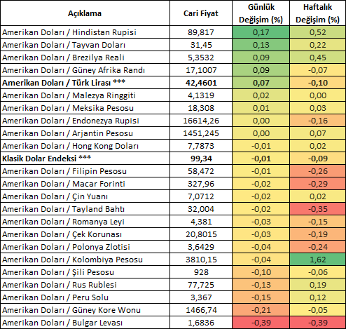 Psikolojik 100 seviyesi altında baskılanan ve yeni haftaya da sınırlı negatif başlayan Klasik Dolar endeksi haftanın ikinci işlem gününde an itibariyle nötr bir fiyatlama izlemektedir. 23 gelişen ülke para biriminin yer aldığı EMEA sepetinde ise ABD Doları karşısındaki ayrışma devam ediyor. Günlük performanslar içerisinde en zayıf para birimi Hindistan Rupisi iken, en güçlü para birimi ise Bulgar Levası olmuştur. Türk Lirası listenin zayıf bölgesinde seyrini sürdürürken USDTRY kuru analizin hazırlandığı şu sıralar 42,46 seviyesine yakın seyrini sürdürmektedir.