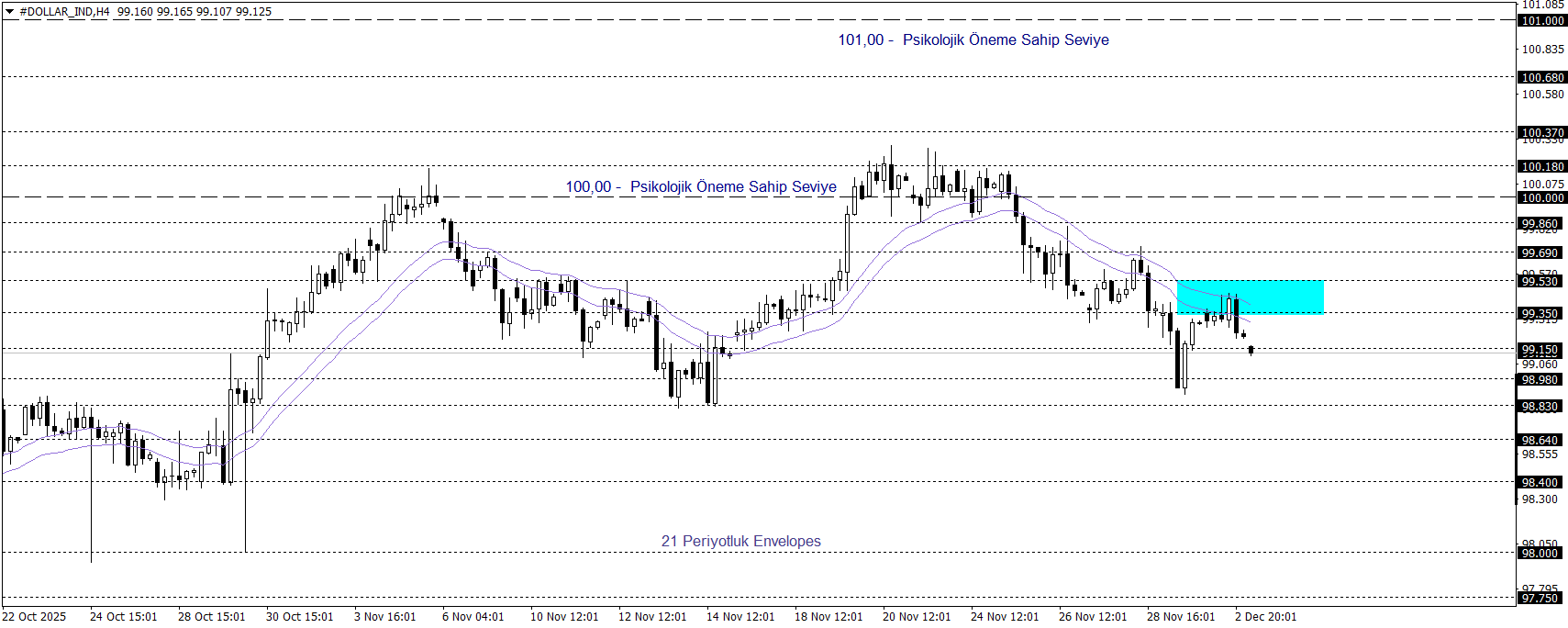 Klasik Dolar Endeksi güncel dönemde 99,15 seviyelerinde kısa vadede negatif tablo ortaya koyuyor. Endeks, Envelopes göstergesinin üst sınırının da işaret ettiği 99,35 – 99,53 bölgesi altında kaldığı sürece 98,00 seviyesine kadar geri çekilme potansiyelini sürdürebilir. Ancak söz konusu bölgenin üzerinde kalıcılık sağlanması halinde, 101,00 seviyesine doğru yukarı yönlü hareket alanı gündeme gelebilir.