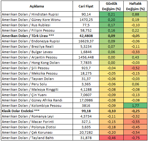 Hafta ortasındayız. ABD’den önem derecesi yüksek veri setinin haftanın kalanında daha fazla dikkat çekebileceği bir ortamda Dolar Endeksinin vereceği reaksiyon, gelişmekte olan ülke para birimleri performansı adına önemlidir Psikolojik 100 seviyesi altında baskılanmaya devam eden Dolar endeksi, an itibariyle de sınırlı negatif fiyatlama davranışını sürdürmektedir. 23 gelişen ülke para biriminin yer aldığı EMEA sepetinde ise ABD Doları karşısındaki ayrışma devam ediyor. Günlük performanslar içerisinde en zayıf para birimi Hindistan Rupisi iken, en güçlü para birimi ise Tayland Bahtı olmuştur. Türk Lirası listenin zayıf bölgesinde seyrini sürdürürken USDTRY kuru analizin hazırlandığı şu sıralar 42,48 seviyesine yakın seyrini sürdürmektedir.