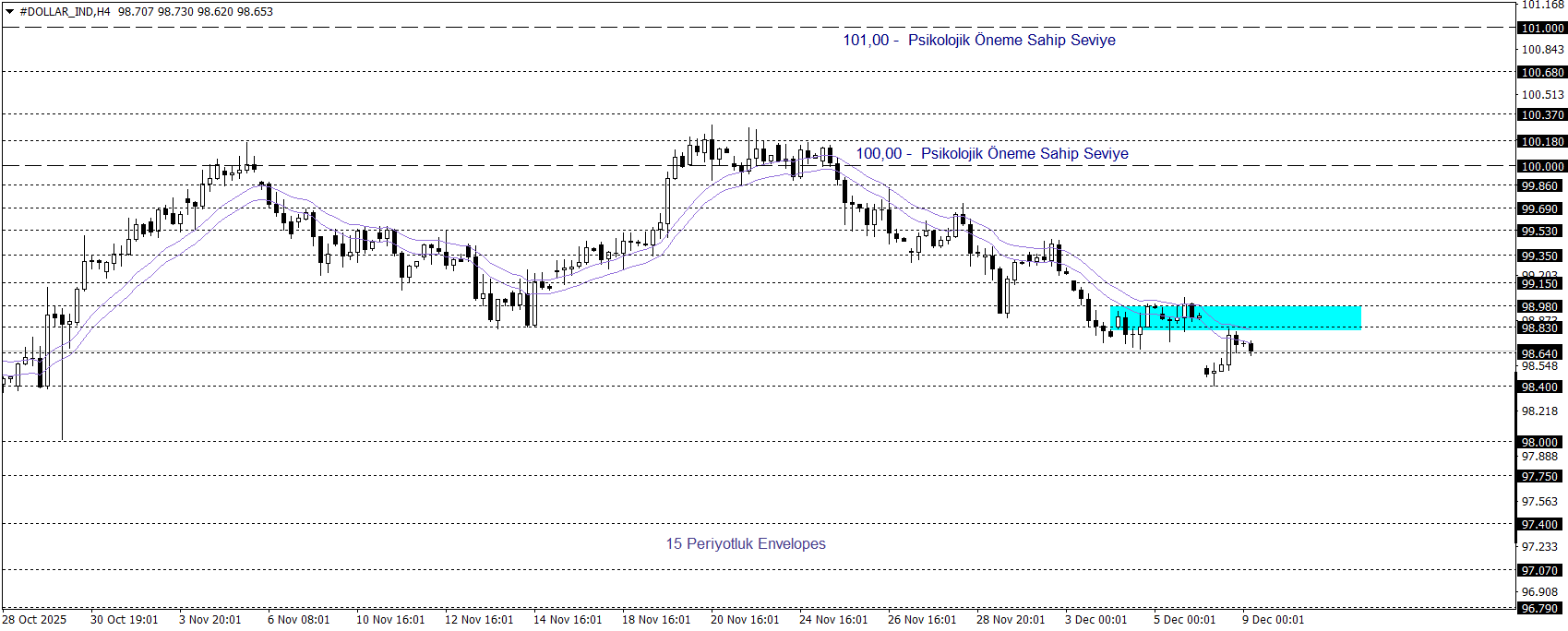 Klasik Dolar Endeksi güncel dönemde 98,50 seviyelerinde kısa vadede negatif tablo ortaya koyuyor. Endeks, Envelopes göstergesinin de işaret ettiği 98,83 – 98,98 bölgesi altında kaldığı sürece 97,07 seviyesine kadar geri çekilme potansiyelini sürdürebilir. Ancak söz konusu bölgenin üzerinde kalıcılık sağlanması halinde, 101,00 seviyesine doğru yukarı yönlü hareket alanı gündeme gelebilir.