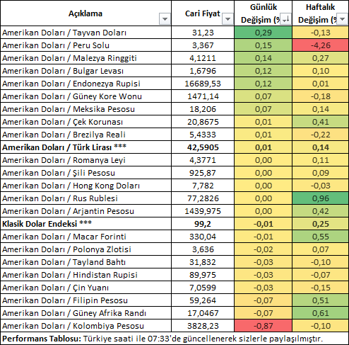 Bugün Fed ve yarın ise TCMB kararları hem dışarıda hem de içeride piyasa katılımcılarının odağında kritik gelişmeler olarak kaydedilmiştir. Gelişmekte olan ülke para birimleri performansının haftanın kalanında daha hareketli olabilme ihtimali mevcut gelişmelerle birlikte ön plandadır. Referans gösterge Klasik Dolar Endeksi an itibariyle sınırlı bir negatif fiyatlama gerçekleştirmekte ve 99 seviyesinin hafif üzerinde işlem görmektedir. 23 gelişen ülke para biriminin yer aldığı EMEA sepetinde ise ABD Doları karşısındaki ayrışma devam ediyor. Günlük performanslar içerisinde en zayıf para birimi Tayvan Doları iken, en güçlü para birimi ise Kolombiya Pesosu olmuştur. Türk Lirası listenin güçlü bölgesinde seyrini sürdürürken USDTRY kuru analizin hazırlandığı şu sıralar 42,59 seviyesine yakın seyrini sürdürmektedir.
