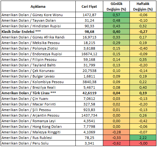 Dünkü Fed ardından bugün gözler içeride TCMB kararlarında olacaktır. Klasik Dolar Endeksi 99 seviyesi altında seyrini sürdürürken an itibariyle de dün yaşanılan gerilemeye karşın tepki yükselişi içerisindedir. 23 gelişen ülke para biriminin yer aldığı EMEA sepetinde ise ABD Doları karşısındaki ayrışma devam ediyor. Özellikle de çoğunluğun zayıf göründüğünü izlemekteyiz. Günlük performanslar içerisinde en zayıf para birimi Güney Kore Wonu iken, güçlü kalabilenler arasında en güçlü para birimi ise Peru Solu olmuştur. Türk Lirası listenin zayıf bölgesinde seyrini sürdürürken USDTRY kuru analizin hazırlandığı şu sıralar 42,60 seviyesine yakın seyrini sürdürmektedir.