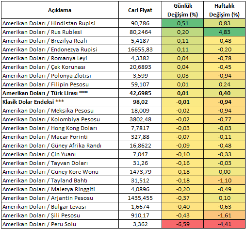 ECB, BoE ve BoJ gibi majör merkez bankaları, PMI, TÜFE ve Tarım Dışı İstihdam gibi önem derecesi yüksek makro – ekonomik göstergelerin sonuçlarına ulaşacağımız kritik bir haftaya Klasik Dolar Endeksi 98 seviyesine yakın başladı. 23 gelişen ülke para biriminin yer aldığı EMEA sepetinde ABD Doları karşısındaki ayrışma devam ediyor. Günlük performanslar içerisinde en zayıf para birimi Hindistan Rupisi iken, en güçlü para birimi ise Peru Solu olmuştur. Türk Lirası listenin zayıf bölgesinde seyrini sürdürürken USDTRY kuru analizin hazırlandığı şu sıralar 42,69 seviyesine yakın seyrini sürdürmektedir.