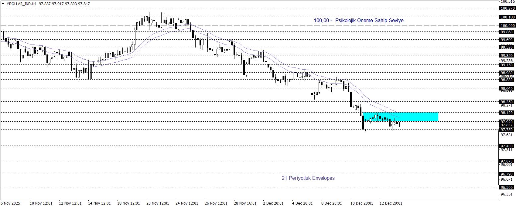 Klasik Dolar Endeksi, güncel dönemde 97,90 seviyeleri civarında aşağı yönlü görünümünü koruyor. Endeks, Envelopes göstergesinin işaret ettiği 98,12 – 97,92 bölgesinin altında kaldığı sürece 96,50 seviyesine doğru geri çekilme potansiyelini sürdürebilir. Buna karşın, bu bölgenin üzerinde kalıcılık sağlanması durumunda 98,83 seviyesine doğru yukarı yönlü hareket olasılığı gündeme gelebilir.