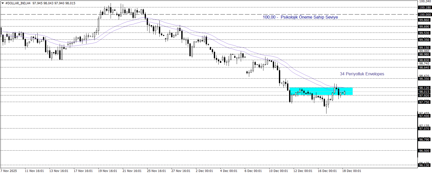 Klasik Dolar Endeksi, güncel dönemde 97,90 seviyeleri civarında kararsız bölgede fiyatlanıyor. Endeks, Envelopes göstergesinin işaret ettiği 98,12 – 97,92 bölgesi ve altında fiyatlandıkça 96,50 seviyesine doğru geri çekilme potansiyelini sürdürebilir. Buna karşın, bu bölgenin üzerinde kalıcılık sağlanması durumunda 98,83 seviyesine doğru yukarı yönlü hareket olasılığı gündeme gelebilir.