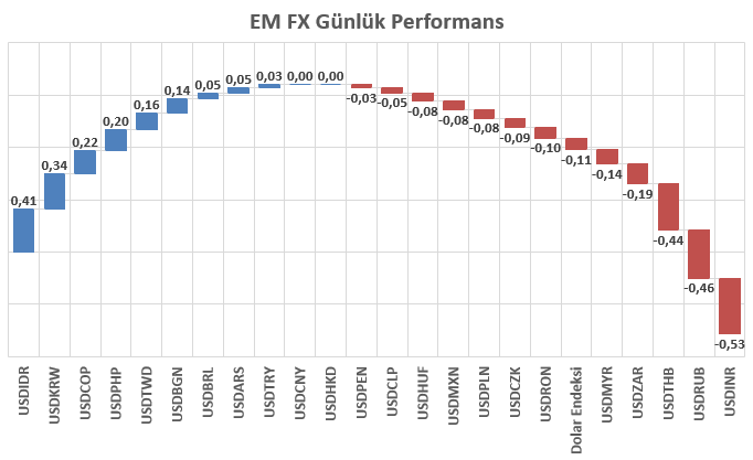98 seviyesinin üzerinde haftaya başlayan Klasik Dolar Endeksi (DXY), geçtiğimiz hafta 97,45 seviyesini dip kabul etmesi ardından yılı tamamlayana kadar iyimser bir reaksiyon verecek mi sorgulamasını yapmamızı sağlamaktadır. Asya, Latin Amerika ve EMEA bölgelerinden 23 gelişmekte olan ülke para birimini kapsayan EM FX sepetinde, ABD Doları karşısında göreli performans farklılaşması ise devam etmektedir. Günlük bazda en zayıf performans Endonezya Rupisinde izlenirken, en güçlü para birimi Hindistan Rupisi olmuştur. Türk Lirası ise sepet genelinde zayıf tarafta konumlanmaya devam ederken, USDTRY kuru analizin hazırlandığı saatler itibarıyla 42,80 seviyesine yakın işlem görmektedir.
