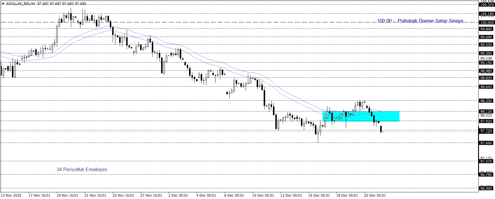 Klasik Dolar Endeksi güncel dönemde 97,70 seviyelerinde aşağı yönlü tabloyu sürdürüyor. Endeks, Envelopes göstergesinin de işaret ettiği 97,92 – 98,12 bölgesi altında kaldığı sürece 96,50 seviyesine kadar geri çekilme potansiyelini sürdürebilir. Ancak söz konusu bölgenin üzerinde kalıcılık sağlanması halinde, 100,00 seviyesine doğru yukarı yönlü hareket alanı gündeme gelebilir.