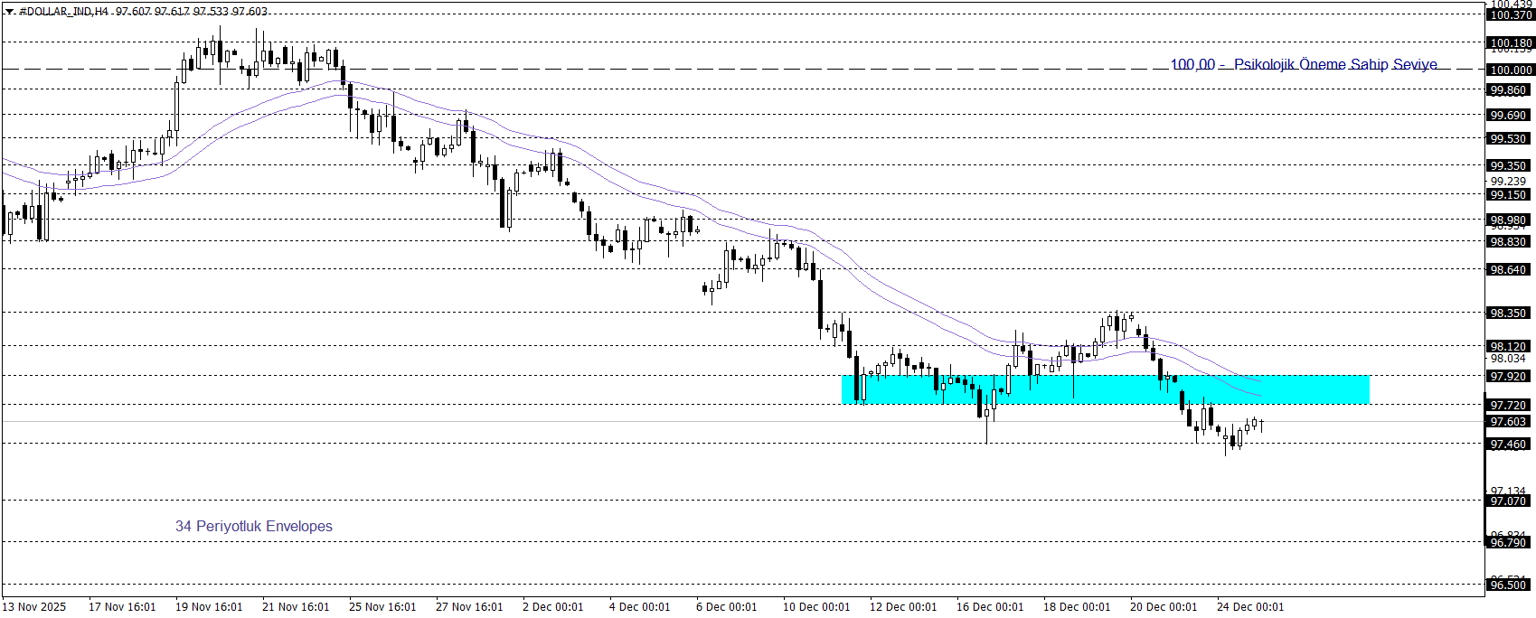Klasik Dolar Endeksi güncel dönemde yaklaşık 97,60 seviyelerinde aşağı yönlü tabloyu sürdürüyor. Endeks, Envelopes göstergesinin de işaret ettiği 97,92 – 97,72 bölgesi altında kaldığı sürece 96,50 seviyesine kadar geri çekilme potansiyelini sürdürebilir. Ancak söz konusu bölgenin üzerinde kalıcılık sağlanması halinde, 100,00 seviyesine doğru yukarı yönlü hareket alanı gündeme gelebilir.
