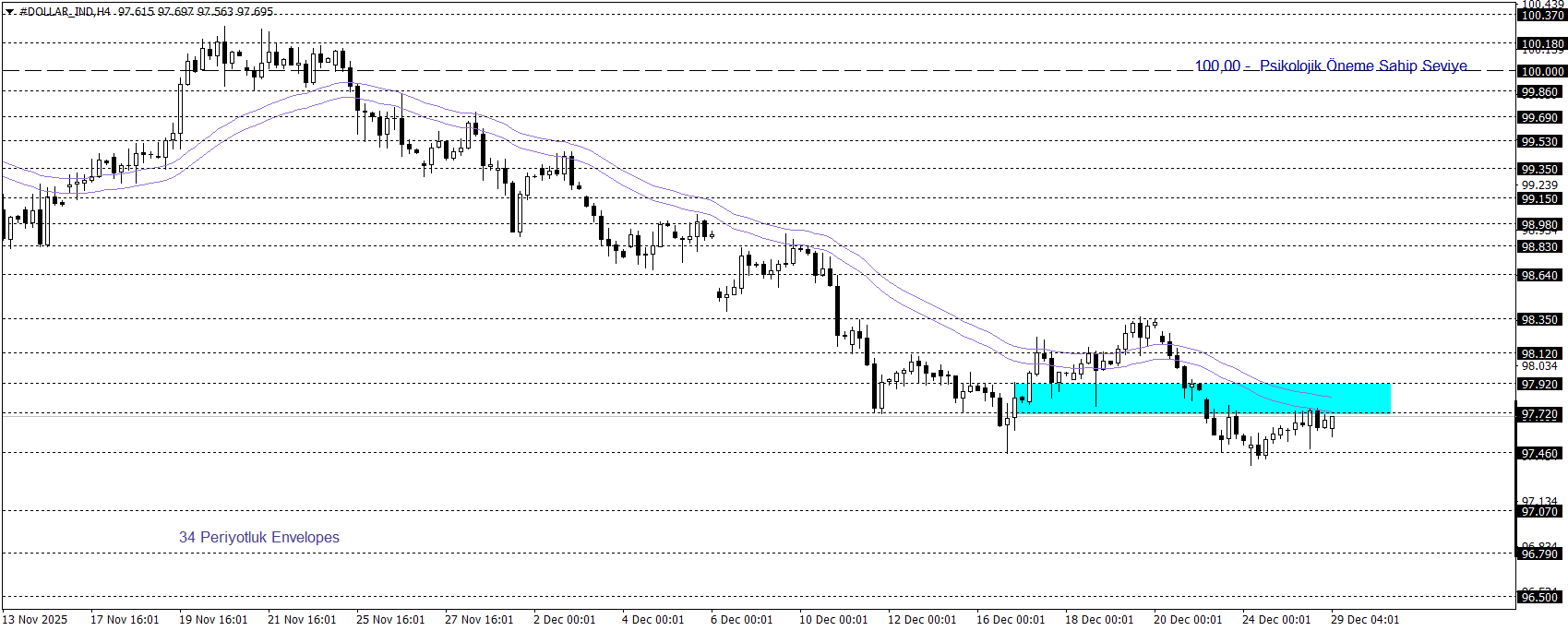 Klasik Dolar Endeksi güncel dönemde yaklaşık 97,70 seviyelerinde aşağı yönlü tabloyu sürdürüyor. Endeks, Envelopes göstergesinin de işaret ettiği 97,92 – 97,72 bölgesi altında kaldığı sürece 96,50 seviyesine kadar geri çekilme potansiyelini sürdürebilir. Ancak söz konusu bölgenin üzerinde kalıcılık sağlanması halinde, 100,00 seviyesine doğru yukarı yönlü hareket alanı gündeme gelebilir.