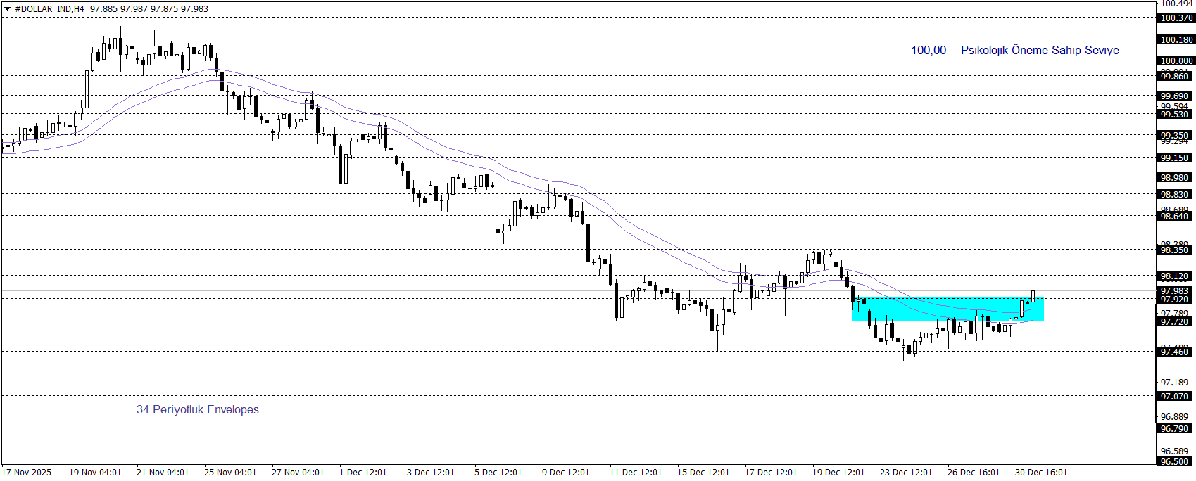 Klasik Dolar Endeksi güncel olarak 97,95 civarında işlem görürken, yukarı yönlü görünümünü koruyor. Envelopes göstergesinin işaret ettiği 97,92–97,72 bölgesi üzerinde kalındığı sürece, endeksin 100,00 seviyesine doğru yükseliş potansiyelini sürdürmesi beklenebilir. Buna karşın bu bölgenin altına sarkılması durumunda, 96,50 seviyesine doğru bir geri çekilme riski öne çıkıyor.