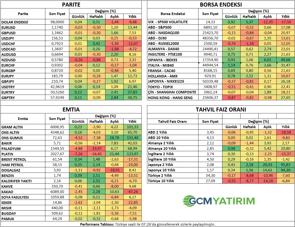 Dün yayımlanan FOMC toplantı tutanakları, üyelerin çoğunun enflasyonun zamanla düşmesi halinde ek faiz indirimlerine ılımlı baktığını gösterdi. Ancak ayrışma, indirimin zamanlaması ve miktarı konusunda oldu. Tutanaklar sonrasında Fed’in Ocak ayındaki toplantıda beklemede kalacağı tahminleri güçlendi. Buna karşın Mart toplantısında indirim olacağı tahminleri hafif güç kazanarak yaklaşık 53% oldu. (Kaynak: CME)