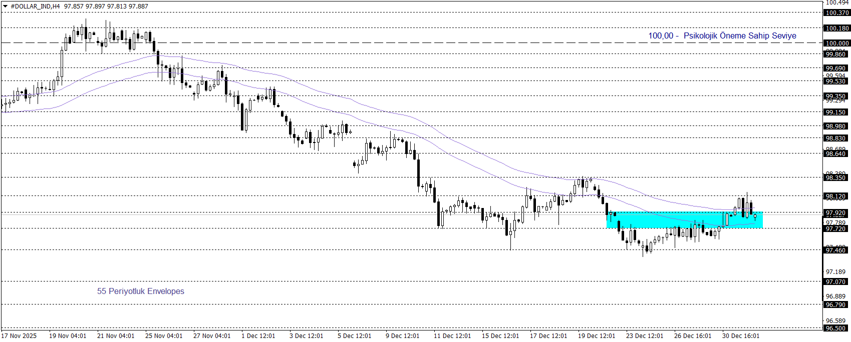Klasik Dolar Endeksi güncel olarak 97,90 civarında işlem görürken, yukarı yönlü görünümünü koruyor. Envelopes göstergesinin alt sınırının da işaret ettiği 97,92–97,72 bölgesi ve üzerinde kalındığı sürece, endeksin 100,00 seviyesine doğru yükseliş potansiyelini sürdürmesi beklenebilir. Buna karşın bu bölgenin altına sarkılması durumunda, 96,50 seviyesine doğru bir geri çekilme riski öne çıkıyor.