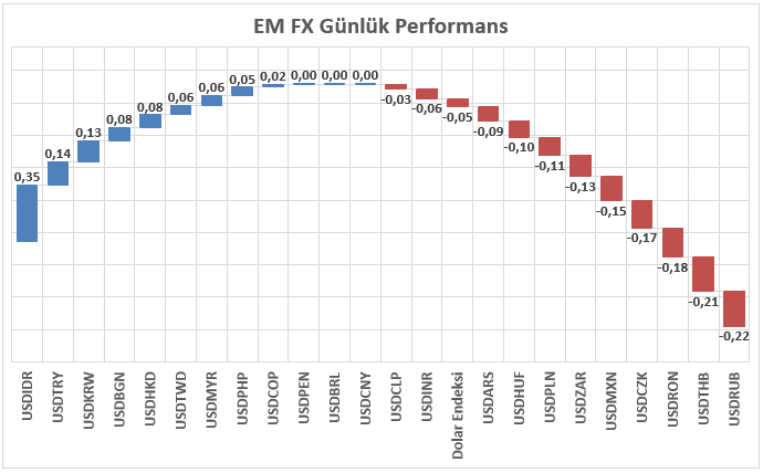 Yeni yılın ilk ancak haftanın son işlem günündeyiz. Klasik Dolar Endeksi (DXY) 98 seviyesinin hafif altında, haftayı sınırlı pozitif kapatmaya, an itibariyle de kısmi negatif performans ile seyrini sürdürmektedir. Asya, Latin Amerika ve EMEA bölgelerinden 23 gelişmekte olan ülke para birimini kapsayan EM FX sepetinde ise ABD Doları karşısında göreceli performans farklılaşması devam etmektedir. Günlük bazda en zayıf performans Endonezya Rupisi olarak izlenirken, en güçlü para birimi Rus Rublesi olmuştur. Türk Lirası ise sepet içerisinde zayıf tarafta konumlanmaya devam ederken, USDTRY kuru analizin hazırlandığı saatler itibarıyla 43,01 seviyesine yakın işlem görmektedir.