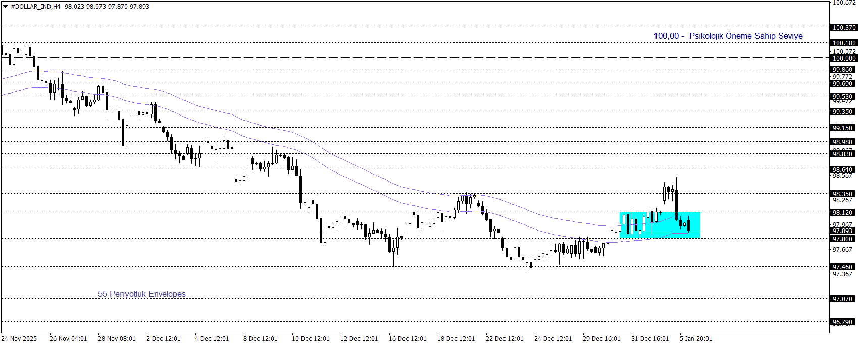 Klasik Dolar Endeksi güncel olarak 97,90 civarında işlem görürken, yukarı yönlü görünümünü koruyor. Envelopes göstergesinin üst sınırının da işaret ettiği 97,92–98,12 bölgesi ve üzerinde kalındığı sürece, endeksin 100,00 seviyesine doğru yükseliş potansiyelini sürdürmesi beklenebilir. Buna karşın bu bölgenin altına sarkılması durumunda, 96,50 seviyesine doğru bir geri çekilme riski öne çıkıyor.