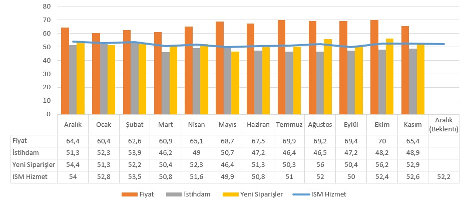 ISM Hizmet PMI Kasım ayında 52,4 puandan 52,6 seviyesine ulaşmıştı. Yeni siparişlerdeki hızlanma azalsa da devam etmiş, fiyat baskıları maliyet kaleminin 70 puandan 65,4’e gerilemesiyle azalma göstermişti.