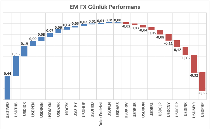 97,40 seviyesini dip kabul eden ve 98 seviyesi üzerindeki istekliliğini sürdüren Klasik Dolar Endeksi (DXY), haftanın dördüncü işlem gününde an itibariyle sınırlı bir pozitif fiyatlama ile işlem görmektedir. Asya, Latin Amerika ve EMEA bölgelerinden 23 gelişmekte olan ülke para birimini kapsayan EM FX sepetinde ise ABD Doları karşısında göreceli performans farklılaşması devam etmektedir. Günlük bazda en zayıf performans Tayvan Doları olarak izlenirken, en güçlü para birimi Filipin Pesosu olmuştur. Türk Lirası ise sepet içerisinde zayıf tarafta konumlanmaya devam ederken, USDTRY kuru analizin hazırlandığı saatler itibarıyla 43,04 seviyesine yakın işlem görmektedir.