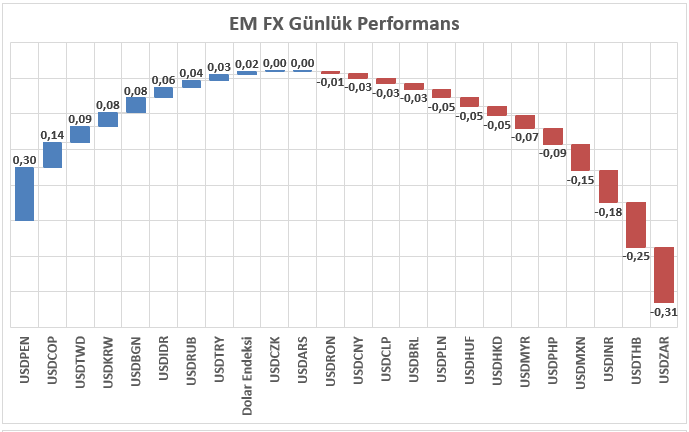Klasik Dolar Endeksi, haftalık performansını sınırlı pozitif bölgeye taşıyan iyimser bir fiyatlama ile hafta ortasına ulaşırken an itibariyle de pozitif düşüncesini sınırlı bir şekilde sürdürmeye çalışmaktadır. Asya, Latin Amerika ve EMEA bölgelerinden 23 gelişmekte olan ülke para birimini kapsayan EM FX sepetinde ise ABD Doları karşısında göreceli performans farklılaşması devam etmektedir. Günlük bazda en zayıf performans Peru Solu olarak izlenirken, en güçlü para birimi Güney Afrika Randı olmuştur. Türk Lirası ise sepet içerisinde zayıf tarafta konumlanmaya devam ederken, USDTRY kuru analizin hazırlandığı saatler itibarıyla 43,15 seviyesine yakın işlem görmektedir.